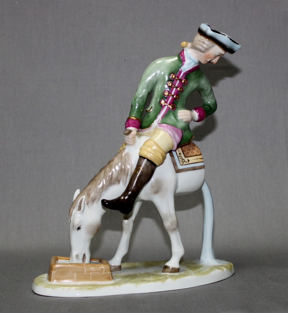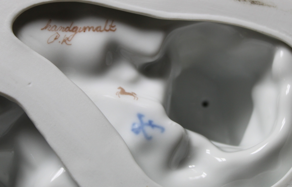 #60 Porzellan. Wagner & Apel - Lippelsdorf. Junges Liebespaar mit Pferd. Figurengruppe, mattes Inkarnat, pastelltonige polychrome Porzellanskulptur auf naturalistischem Sockel. Auf der Unterseite mit blauer Stempelmarke “Krone – W A“. Produktion aus der 2. Hälfte des 20. Jhrdts. Höhe 26 cm. (20)