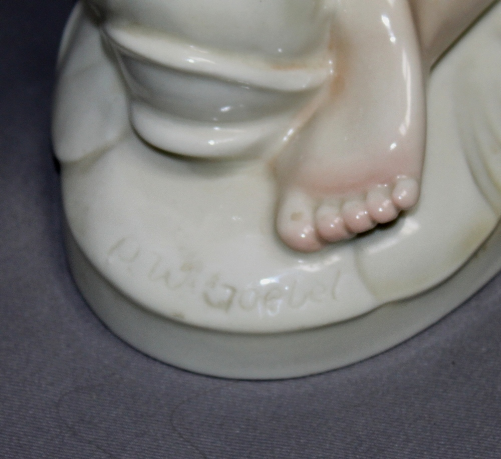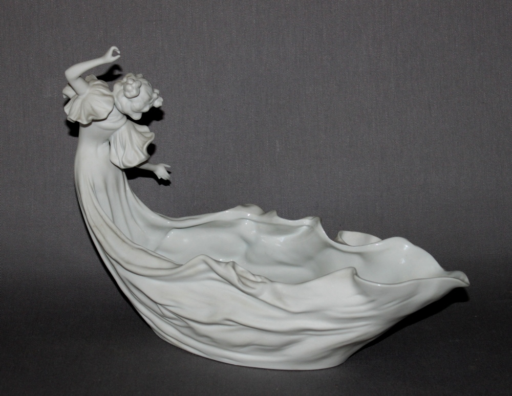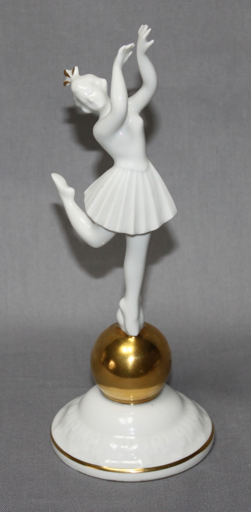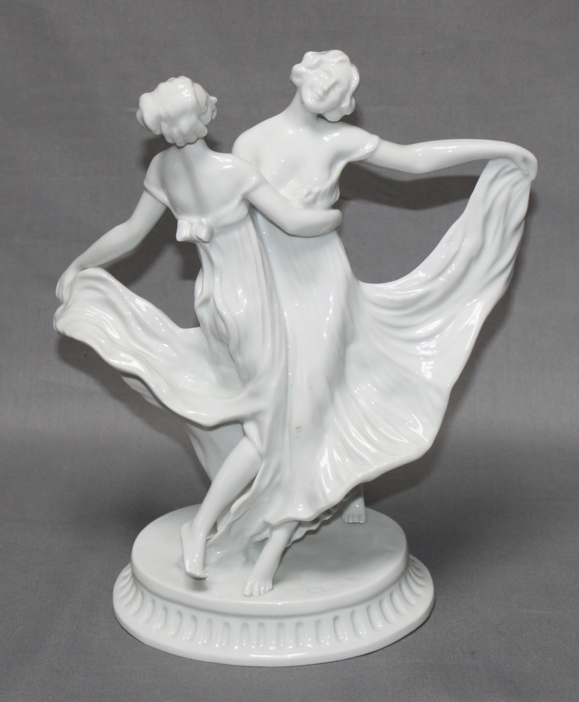 #54 Porzellan. Schwarzburger Werkstätten für Porzellankunst - Rudolstadt. “Tanzende Mädchen“. Monochrome Porzellanfigur auf flachem . Auf der Oberseite des Sockels mit Pressstempel “Claire Volkhart“. Auf der Unterseite mit Presstempel “Fuchs“ und Blaustempel “Aelteste Volkstedter Porzellanfabrik 1762“. Produktion aus der 2. Hälfte des 20. Jhrdts. Höhe 25,5 cm. (20)