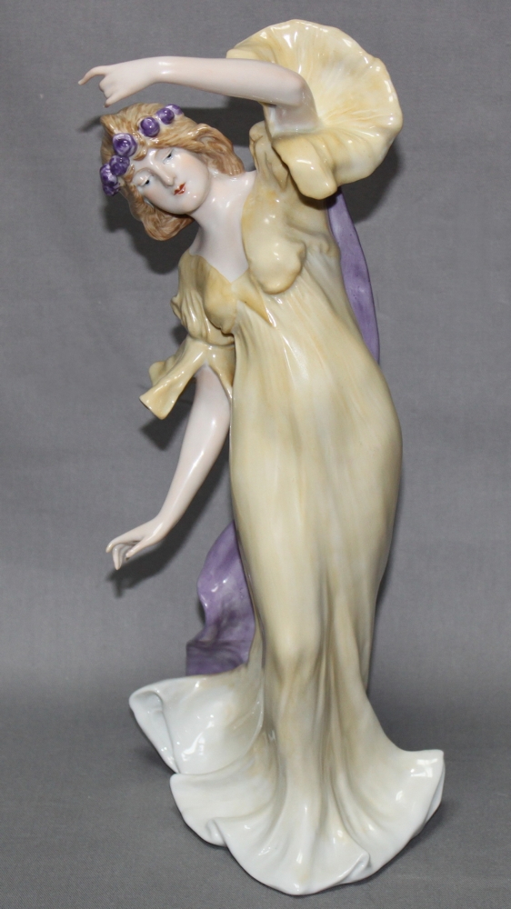 #50 Porzellan. Plaue - Porzellanmanufaktur. Tänzerin im langen Kleid. Polychrome Porzellanfigur einer Tänzerin im Abendkleid. Auf der Unterseite mit blauer Stempelmarke “Krone P M P“ und Unterschrift “v. Schierholz“ und “J. Freitag“. Produktion aus der 2. Hälfte des 20. Jhrdts. Höhe 33 cm. (20)