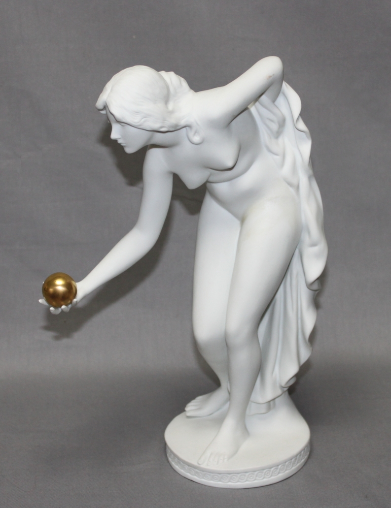 #51 Porzellan. Scheibe - Alsbach / Thüringen. Aktdarstellung - junge Frau mit goldener Kugel sich leicht nach vorne beugend. Monochrome Biskuitporzellanskulptur nach einen historischen Vorbild auf rundem, flachen Sockel. Auf der Rückseite mit blauer Porzellanmarke “S mit horizontalen gekreuzten Strichen“ und Stempelmarke “Drache“. Produktion aus der 2. Hälfte des 20. Jhrdts. Höhe 30 cm. (20)