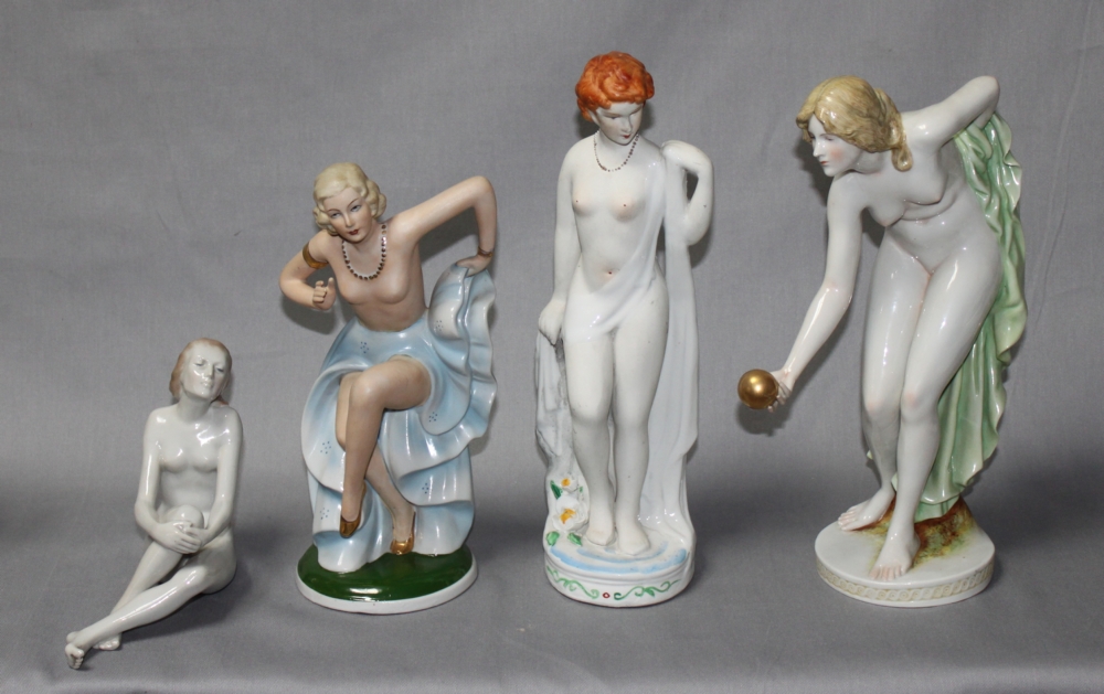 #64 Porzellan. Beispielsammlung Weibliche Porzellanfiguren zum Teil Aktdarstellungen. Acht polychrome Porzellanfiguren, verschiedene Höhen, unterschiedliche Hersteller. (20)