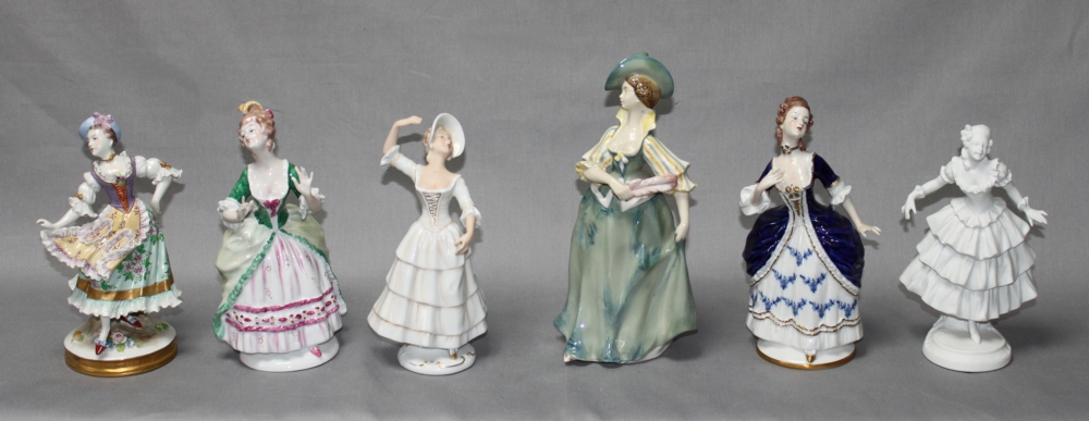 #65 Porzellan. Beispielsammlung. Weibliche Porzellanfiguren. Sechs polychrome Porzellanfiguren, verschiedene Höhen, unterschiedliche Hersteller. (20)