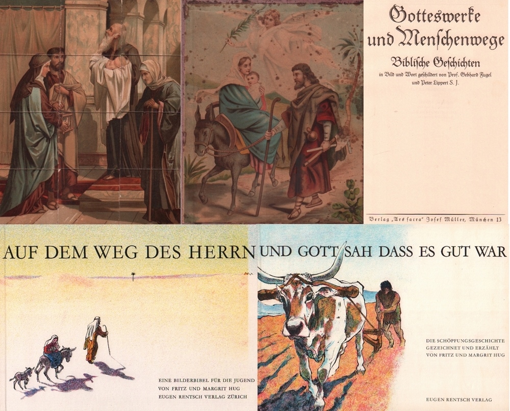 156 Kinderbuch – Konvolut mit 4 Werken religiösen Inhalts für Kinder. Verschiedene Verlage und Jahre. Folio und 8°. Mit Abbildungen. Illustrierte Leinen- bzw. Halbleinenbände. (50)