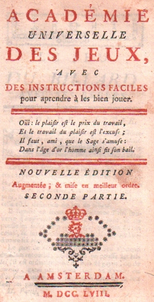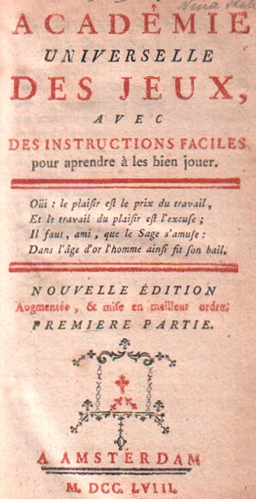 577 Académie Universelle des Jeux, avec des instructions faciles pour aprendre à les bien jouer. Nouvelle édition, Augmentée, & mise en meilleur ordre. 2 Teile in 1 Band. Amsterdam 1758. 8°. Mit Titel- und Textvignetten, wenigen Tabellen und Textskizzen. 1 Bl., 384, Titel, 294 Seiten. Brauner Lederband mit Rückenschildchen. (79)