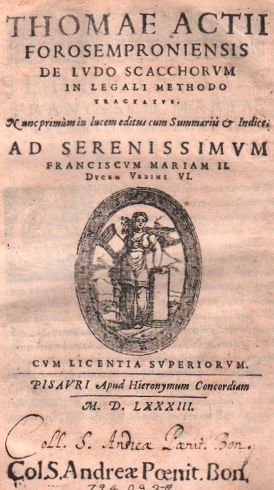 579 Azzio, Tommaso. De ludo scacchorum in legali methodo tractatus. Nunc primum in lucem editus cum Summariis & Indice ... Pesaro, Hieronymus Concordia, 1583. 8°. Mit 1 Holzschnittporträt im Text, 1 Titelvignette und wenigen Holzschnittinitialen. 4 unnum. Bll. (inkl. Titel), 108 Bll., 18 unnum. Bll. Index und Errata. Pergamentband. (79)