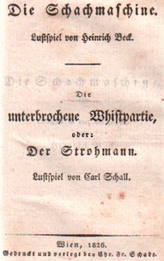 582 Beck, Heinrich. Die Schachmaschine. Lustspiel. / Schall, C. Die unterbrochene Whistpartie oder: Der Strohmann. Lustspiel. 2 Teile in diesem Sammelband: Deutsche Schaubühne seit Lessing und Schröder bis auf die neueste Zeit. 25. – 27. Bändchen. Wien, Schade, 1826. 12°. 191, 159, 186 Seiten. Brauner Halbleinenband mit Rückenschildchen. (79)