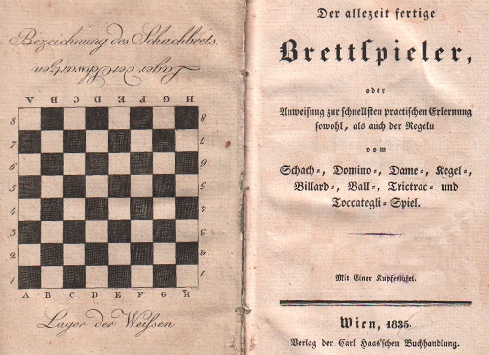 616 Spielbuch. Der allezeit fertige Brettspieler, oder Anweisung zur schnellsten practischen Erlernung sowohl, als auch der Regeln vom Schach-, Domino-, Dame-, Kegel-, Billard-, Ball-, Trictrac-, und Toccategli-Spiel. Wien, Haas, 1835. 8°. Mit Kupferstichfrontispiz. 144 Seiten. Halbleinenband. (49)