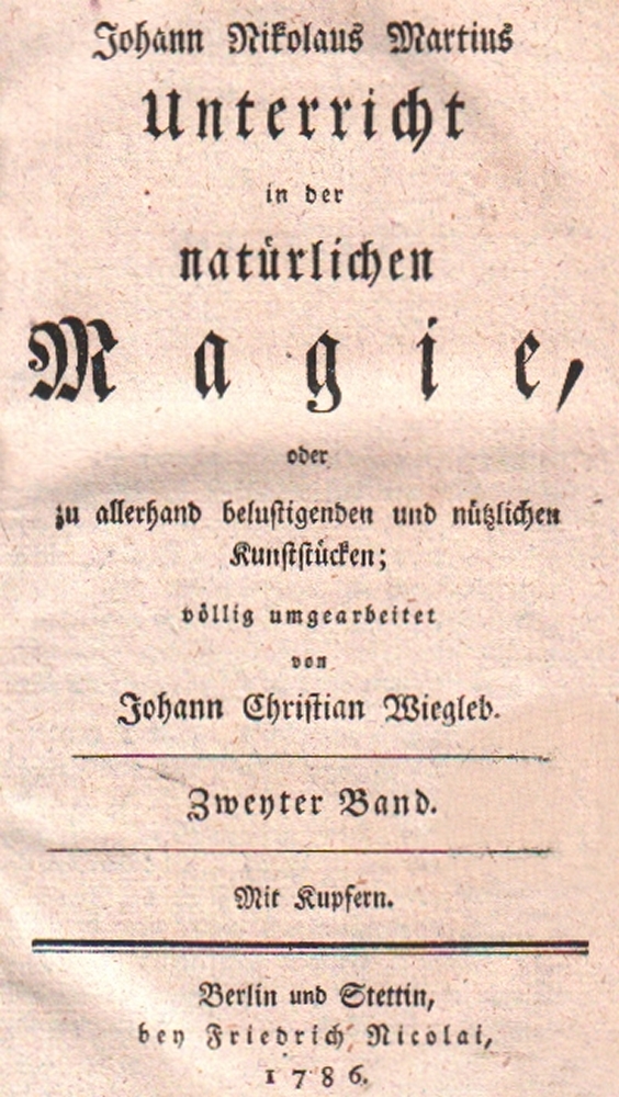 621 Wiegleb, Johann Christian. Johann Nikolaus Martius Unterricht in der natürlichen Magie, oder zu allerhand belustigenden und nützlichen Kunststücken; völlig umgearbeitet von Johann Christian Wiegleb. 2. Band. Berlin und Stettin, Nicolai, 1786. 8°. Mit 14 gefalteten Kupfertafeln. 9 Bll., 406 Seiten, 6 Bll. Register (Vortitel fehlt). Brauner Halblederband mit Rückenschildchen. (79)