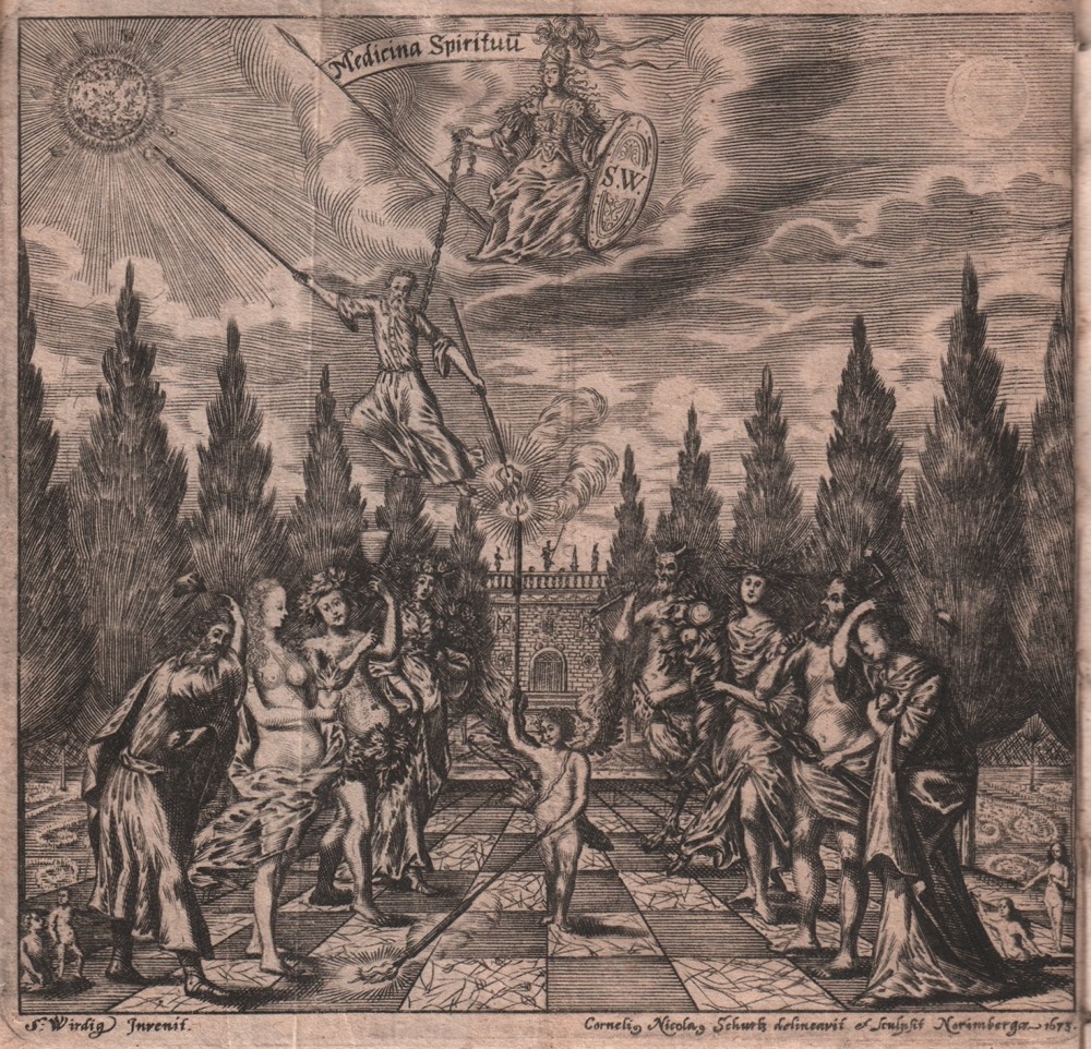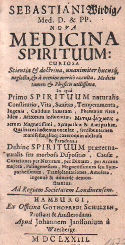 623 Wirdig, Sebastian. Nova Medicina Spirituum: Curiosa Scientia & doctrina, unanimiter hucusq[ue] neglecta, & a nemine merito exculta, Medicis tamen & Physicis utilissima; In qua Primo Spirituum naturalis Constitutio, Vita, Sanitas ... Dehinc Spirituum praeternaturalis seu morbosa Dispositio ... demonstrantur. Band 1 (von 2). Hamburg, Schulze, 1673. 12°. Mit 1 gefalteten gestochenen Frontispiz. 10 (statt 21) Bll., 238 Seiten. Marmorierter Pappband. (79)