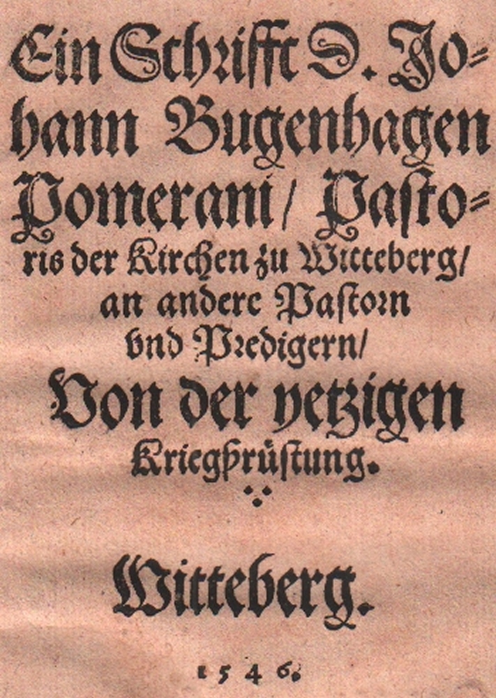 99 Bugenhagen, Johannes. Ein Schrifft D. Jo /hann Bugenhagen/ Pomerani / Pasto/ ris der Kirchen zu Witteberg/ an andere Pastorn /vnd Predigern/ Von der jetzigen Kriegsrüstung. Wittenberg, (Gedruckt durch Hans Lufft), 1546. 8°. 8 Bll. Schlichter privater Pappband. (11)