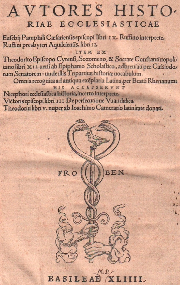 106 Kirchengeschichte. Autores Historiae Ecclesiasticae Eusebij Pamphili Caesariensis episcopi libri IX. Ruffino interprete. Ruffini presbyteri Aquileiensis, libri II. ITEM EX Theodorito Episcopo Cyrensi, Sozomeno, & Socrate Constantinopoli/tano libri XII. uersi ab Epiphanio Scholastico, adbreuiati per Cassiodo/rum Senatorem: unde illis Tripartitae historiae uocabulum. Omnia recognita ad antiqua exeplaria Latina, per Beatu Rhenanum. HIS ACCESSERVNT Nicephori ecclesiastica historia, incerto interprete. Victoris episcopi libri III De persecutione Vuandalica. Theodoriti libri V. nuper ab Ioachimo Camerario latinitate donati. Basel, Froben, Hieronymus der Ältere und Episcopius, Nikolaus der Ältere, 1544. Folio. 6 Bl. (incl. Titel mit Druchermarke), 851 S.(ohne S. 205 – 216) 18 Bl. Index, mit Druckermarke am Ende. Orig. blindgeprägter Schweinslederband über Holzdeckel, die Schließbänder fehlen. (11)