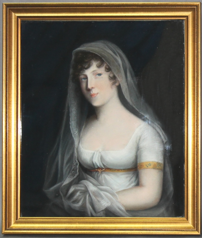 67 Braunschweig. Marie von Baden / Herzogin Marie zu Braunschweig - Lüneburg - Oels. (Ehefrau des Schwarzen Herzogs) Originale Pastellmalerei auf Pergament. Nicht signiert und nicht datiert. Am unteren Rand des Bildes bezeichnet vom Künstler "A la vue pinxit (?)". Arbeit um 1805. Bildgröße 31,5 x 37,7 cm. Rahmengröße 37 x 42,5 cm. (71)