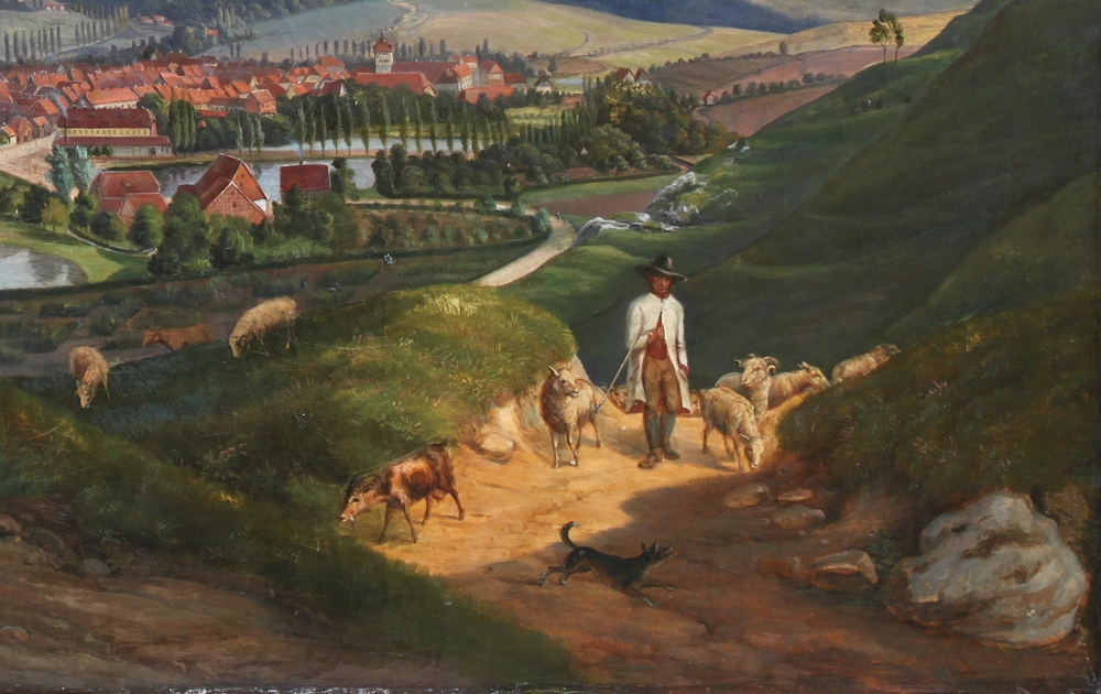 ein Schäfer mit seiner Herde, im Mittelgrund die Gesamtansicht von Osterode und