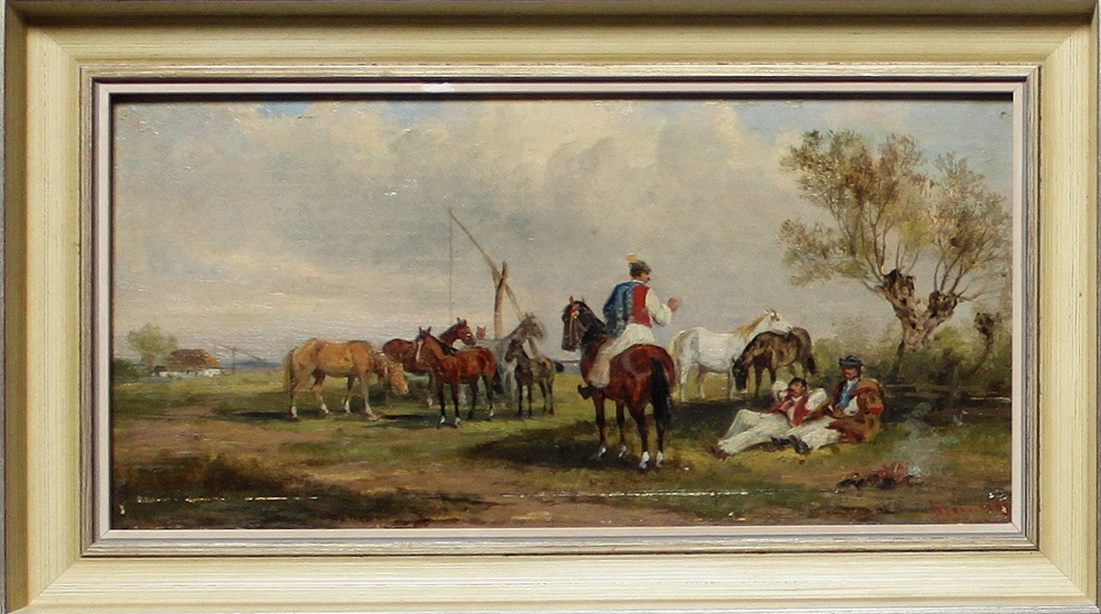 für den Künstler klassisches Motiv mit Reitpferden und figürlicher Staffage.