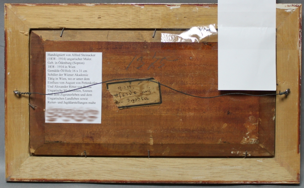 75 Steinacker, Alfred. “Pferde auf der Pusta“. Ölmalerei auf Holzplatte (Mischtechnik). Unten rechts signiert “Steinacker“, Malerei aus den 1890er Jahren. Bildgröße 31 x 15,5 cm. Rahmengröße 37,5 x 23 cm (Querformat). (18)