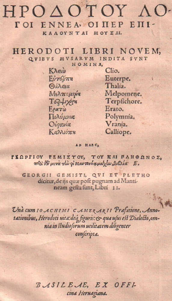 103 Herodot. Logoi ennea (Graece). Libri novem, quibus musarum indita sunt nomina. Georgii Gemisti, qui et Pletho dicitur, deiis que post pugnam ad Mantineam gesta sunt, Libri II. Una cum Ioachimi Camerarii praefatione annotationibus, Herodati vita… . Basel, Herwagen (Johannes d. J.) und Brand (Bernhard), 1557. Folio. 10 Bll. incl Titel, 300 gez. S. 1 Bl. mit Druckermarke. Privater schlichter Pappband des 19. Jhrdts. (11)