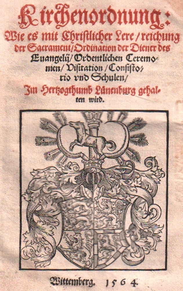 125 Wittenberg. Kirchenordnung Wittenberg. Wie es mit Christlicher Lere / reichung der Sacramente / Ordination der Diener des Evangelii / Ordenlichen Ceremonien / in den Kirchen / Visitation / Consistorio und Schulen / zu Wittenberg und in etlichen Chur und Fürstenthum / Herrschafften und Stedte der Augsburgischen Confession verwand gehalten wird. Wittenberg, Lufft, 1559. Kl. 4°. Mit schöner Holzschnitt- Initiale der Vorrede, kleinen Textinitialen, gedruckten Noten und Druckermarke am Schluß. 144 num. Bll. Defekter Einband der Zeit, der zur Hälfte mit blindgeprägtem Leder bezogen. (11)