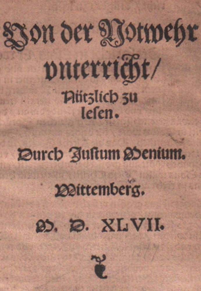 119 Menium, Justus. Von der Notwehr / vnterricht / Nützlich zu / lesen./ Durch Justum Menium. Wittemberg, 1547. Gedruckt in der Churfürstlichen Stat Wittemberg Durch Veit Creutzer. Anno 1547. 4°. 41 Bll. Schlichter privater Pappband. (11)