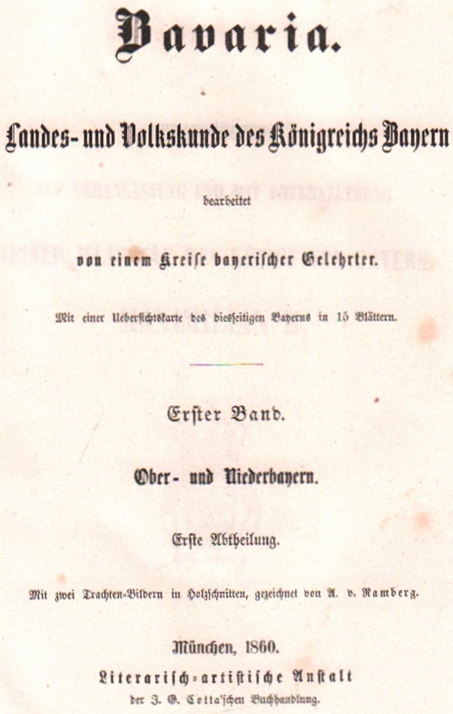 170 Bayern. Bavaria. Landes - und Volkskunde des Königreichs Bayern bearbeitet von einem Kreise bayerischer Gelehrter. 4 Teile und Ortslexikon in zus. 9 Bänden (der Atlasband fehlt). München, Literarisch - artistische Anstalt, 1860 - 1867. Lex 4°. Mit 2 gestochenen Titeln, und 8 Frontispizen (Trachtentafeln) im Holzstich. Gleichförmig ausgeblichene Halblederbände mit goldgeprägten Rückenschildchen. (12)