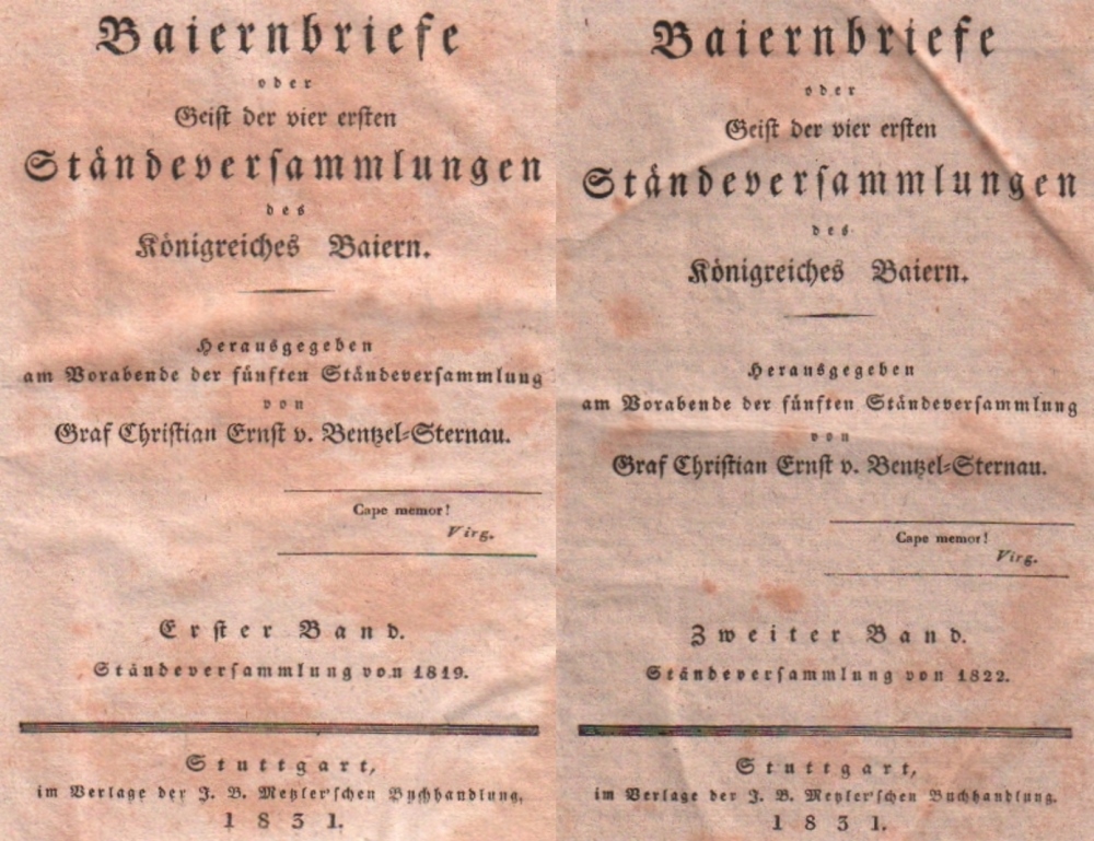 171 Bayern. Bentzel – Sternau, Graf Christian Ernst v. (Hrsg.) Baiernbriefe oder Geist der vier ersten Ständeversammlungen des Königreiches Baiern. Hrsg. am Vorabend der fünften Ständeversammlung. Band 1/1819 und Band 2/1822 von 4 Bänden. Stuttgart, Metzler. 1831/32. 8°. Schlichte Pappbände mit goldgeprägten Rückenschildern. (12)
