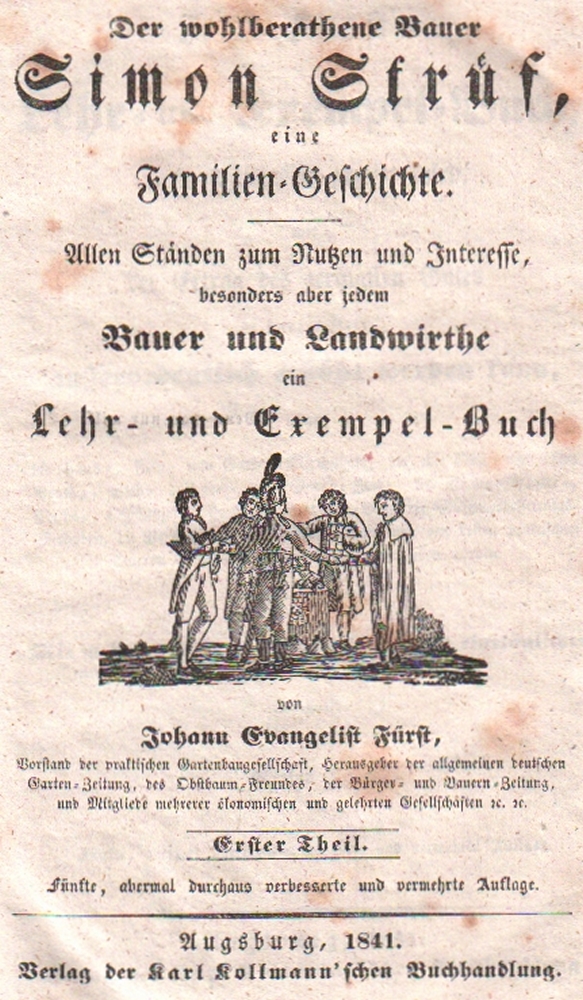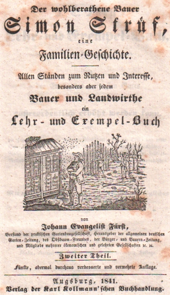 172 Bayern. Fürst. Johann Evangelist. Der wohlberathene Bauer Simon Strüf, eine Familien - Geschichte. Allen Ständen zum Nutzen und Interesse, bes. aber jedem Bauer und Landwirthe ein Lehr –und Exempel-Buch. - J. E. Fürst's Lehr- und Exempel-Buch, worin sonnenklar gezeigt wird, wie der Ertrag des geringsten Gutes in kurzer Zeit außerordentlich erhöht werden kann, wenn die Haus-, Feld- und Garten Wirtschaft, etc. etc. nach den besten praktischen neuern Verbesserungs- Erfahrungen betrieben werden. Mit mehreren andern, sehr nützlichen und einträglichen Neben- Hülfs– Mitteln. 4 Teile in 3 Bänden. Augsburg, Kollmann, & Regensburg, Pustet, 1841. 8°. Mit 3 Titelvignetten und einigen Textabb. Private Halblederbände mit grünem goldgeprägten Rückenschild. (12)