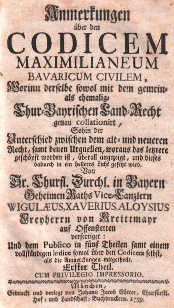 175 Bayern. Kreittmayr, W. X. A. v. Anmerkungen über den Codicem Maximilianeum Bavaricum Civilem… Chur- Bayrischen Land – Recht genau collationiert… 5 Teile in 5 Bänden (ohne die drei Ergänzungsbände). München, Vötter, 1759 – 1768. Lex. 8°. Orig. braune Lederbände mit dekorativer Rückenvergoldung und 2 goldgeprägten Rückenschildern. (12)