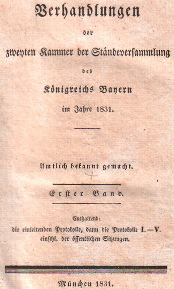 178 Bayern. Ständeversammlung. Verhandlungen der zweiten Kammer der Ständeversammlung des Königreichs Bayern im Jahre 1831. Amtlich bekannt gemacht. Band 1 – 28 letzter Band, den “Reichsabschied“ und die darauf bezüglich königl. Gesetze. Enthaltend sind die Protokolle einschl. der öffentlichen Sitzungen. Beiliegen die Beilagenbände: Band 1 – 14 in 15 Bänden (Bd. 10 in 2 Bde.) Schlichte blaue Pappbände mit gedruckten roten Rückenschildern. (12)