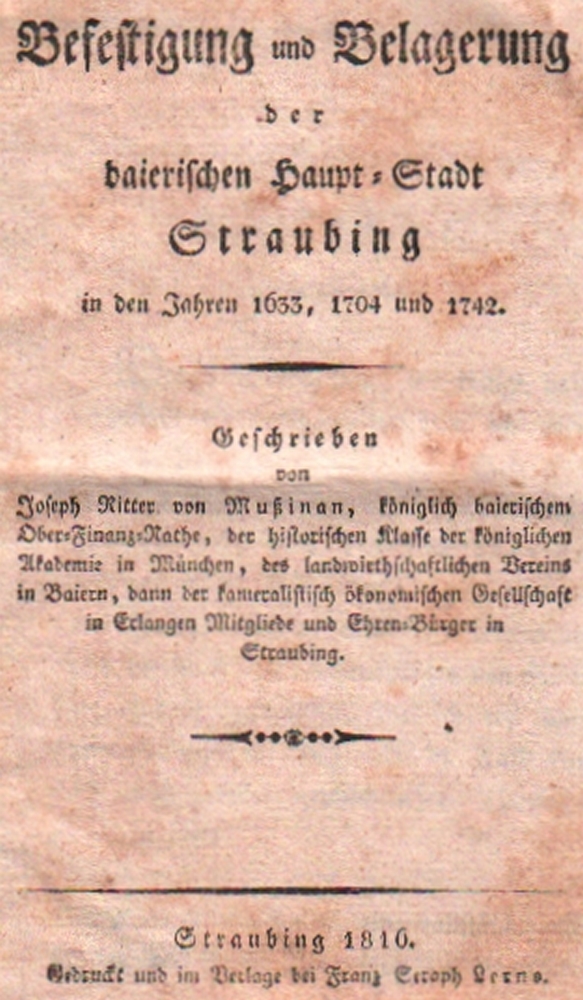 179 Bayern. Straubing. Mußinan, Joseph Ritter v. Befestigung und Belagerung der baierischen Haupt - Stadt Straubing in den Jahren 1633, 1704 und 1742. Straubing, Lerno, 1816. 8°. Mit einer Kupfertafel als Frontispiz. XVI, 279 S. 1 Bl. Druckfehler. Privater marmorierter Pappband mit farbigem Rückenschildchen. (12)